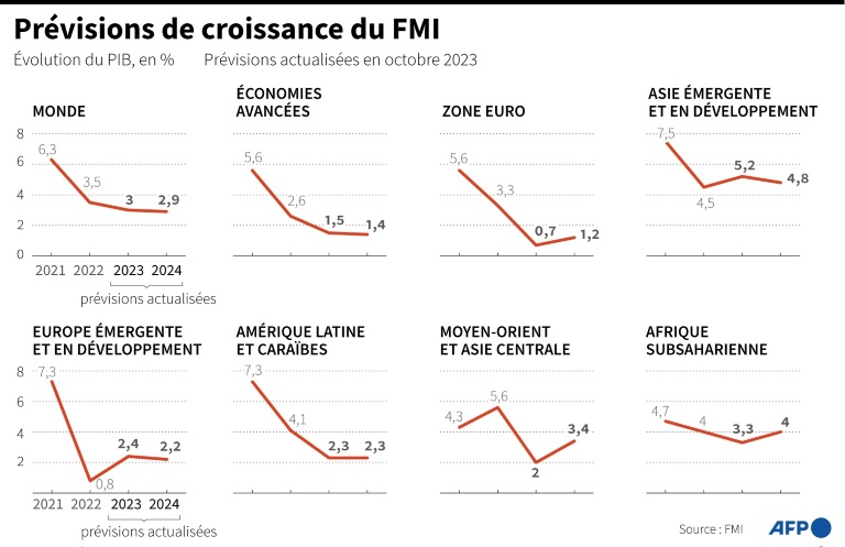 L'institution s'attend toujours à une croissance mondiale de 3% pour 2023, et à peine plus faible en 2024, à 2,9%, soit en légère baisse (-0,1 point de pourcentage) par rapport à son estimation précédente, en juillet.