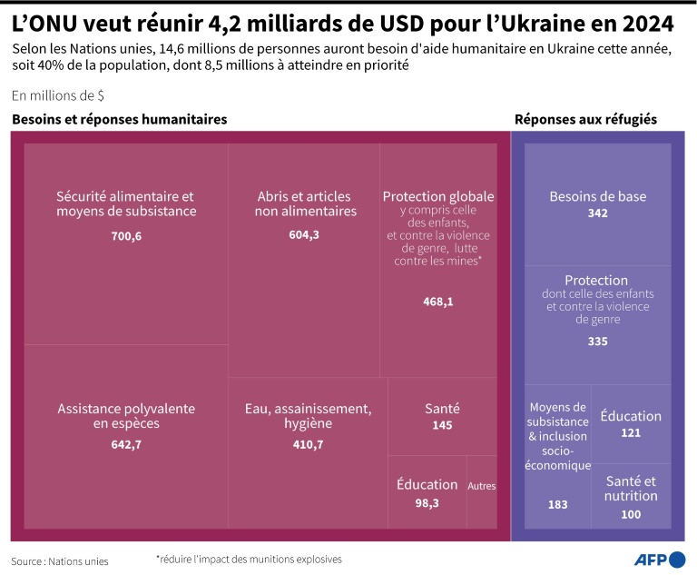 Dans le détail, l'appel aux dons pour l'aide à la population ukrainienne vivant dans le pays s'élève à 3,1 milliards de dollars en 2024, contre 3,9 milliards de dollars l'année précédente - dont 67% ont été financés. C'est sans doute l'appel le mieux financé au monde, a indiqué M. Griffiths, mais l'ONU l'a révisé à la baisse cette année, choisissant de se concentrer sur les besoins les plus urgents.