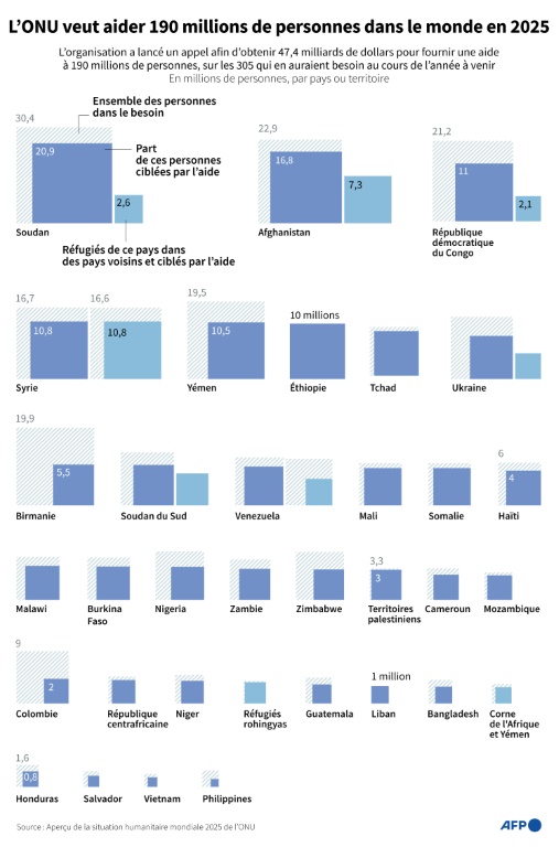 L'ONU a lancé mercredi un appel humanitaire à hauteur de 47,4 milliards de dollars pour aider 190 millions de personnes l'an prochain dans un monde malmené par les conflits et le changement climatique.