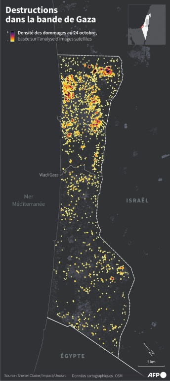 Des images satellite publiées jeudi montrent l'ampleur des destructions, avec des quartiers entiers rasés par les bombardements. Selon l'OCHA, citant le ministère des Travaux publics et du Logement de Gaza, 45% des habitations de la bande de Gaza ont été "endommagées ou détruites".