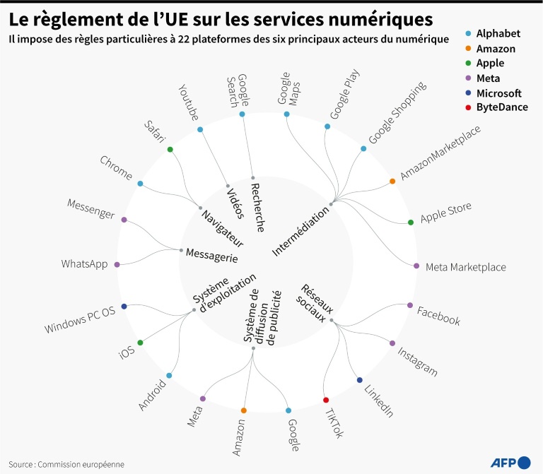 Six champions de la tech - les américains Alphabet (Google), Amazon, Apple, Meta (Facebook, Instagram) et Microsoft, ainsi que le chinois ByteDance, propriétaire de TikTok - sont tenus de s'y conformer à partir de jeudi.
