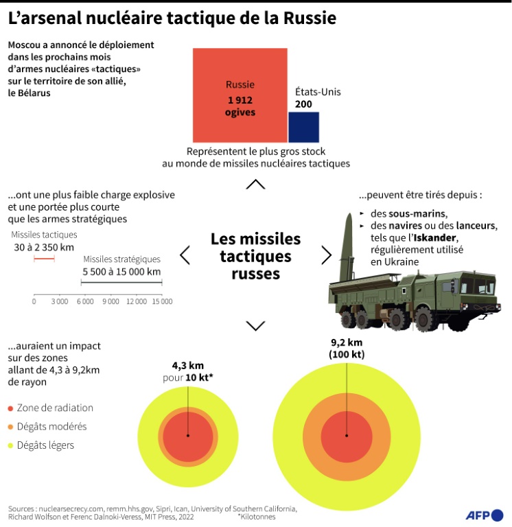En réplique, la Russie a annoncé qu'elle allait déployer des armes nucléaires tactiques chez son seul allié en Europe, le Bélarus, un voisin de l'Ukraine qui a prêté son territoire à l'invasion russe sans pour autant y prendre part activement.