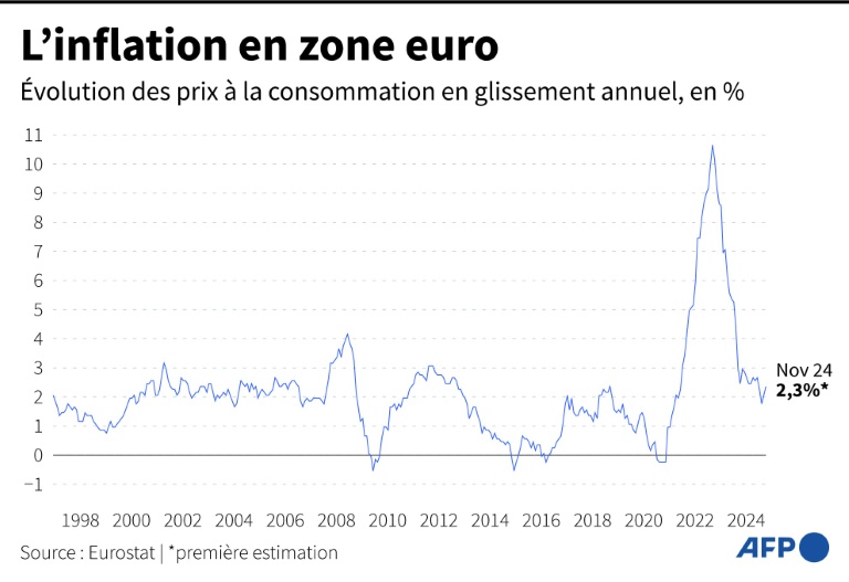Malgré une légère hausse à 2,3% sur un an en novembre, l'inflation dans la zone euro reste bien inférieure à la prévision de 2,6% pour le quatrième trimestre établie par la BCE.
