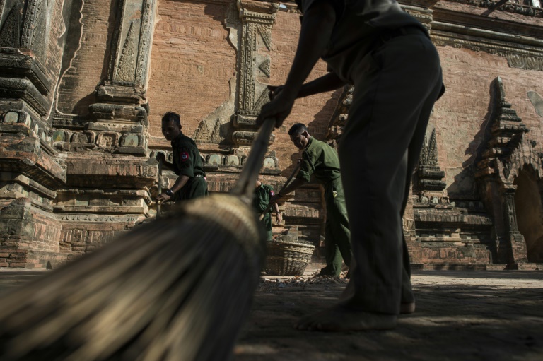 Dans cette plaine verdoyante du centre de la Birmanie, où pointent au milieu des arbres les dômes de milliers de pagodes, les militaires avançaient jeudi pieds nus - comme le veut la coutume dans les temples bouddhistes - pour ramasser et balayer les débris autour des monuments.