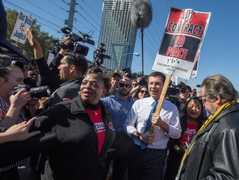 Le modéré Pete Buttigieg dispose aussi d'une bonne organisation. Pour contrer Bernie Sanders, ses rivaux tentent de profiter de la controverse qui oppose le syndicat des employés de la restauration, très puissant dans les casinos de Las Vegas, aux partisans du socialiste.