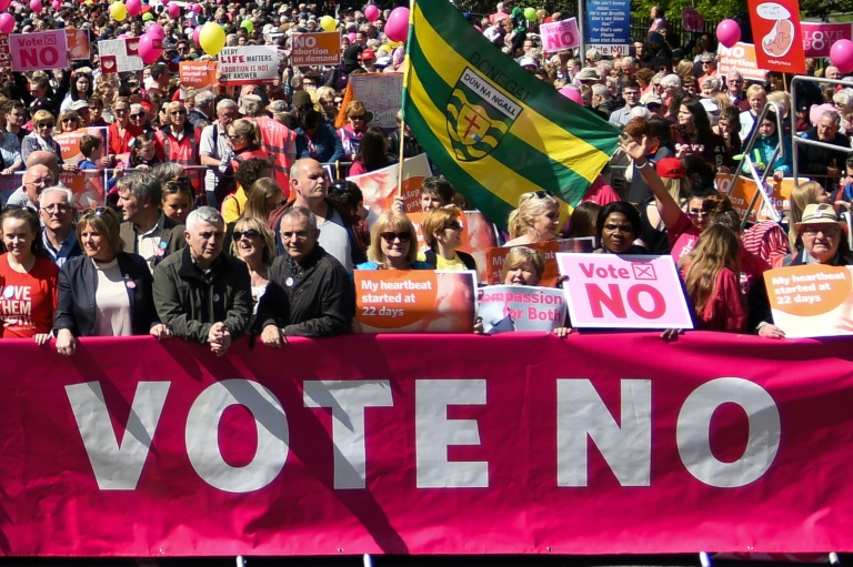 Samedi encore, des milliers de manifestants favorables au maintien de la loi se sont réunis dans le centre de Dublin derrière une large banderole proclamant "sauvez des vies, votez non".Au départ, 67% des Irlandais avaient voté en faveur du 8e amendement qui proscrit tout recours à l'IVG, possible depuis 2013 seulement si la vie de la mère est en danger.