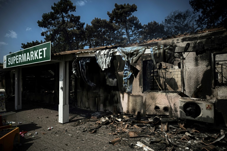 Comme les occupants des "Flots bleus" (en fait "La dune"), décor de la très populaire série de films "Camping" au pied de la dune du Pilat, dont une bonne partie n'a pas résisté aux flammes. A l'entrée, l'effigie du personnage de Patrick Chirac est encore debout. Mais un peu plus loin, comme en écho à l'avertissement de son célèbre homonyme, "notre maison brûle", les bungalows sont éventrés, des véhicules calcinés, le bâtiment des sanitaires dévasté.