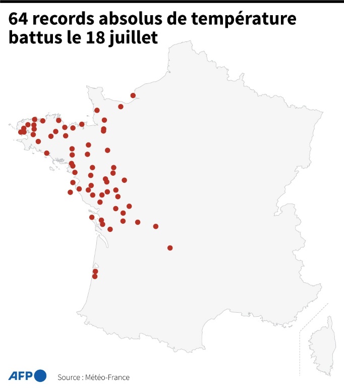 "C'était malheureusement quelque chose d'attendu," dit l'AFP Matthieu Sorel, climatologue à Météo-France. Mais pour le spécialiste, plus encore que le nombre, "ce qui est significatif c'est l'amplitude" entre anciens et nouveaux records. "Plus quatre degrés à Brest, c'est colossal". A la pointe de la Bretagne le mercure s'est en effet envolé, de 35,1°C en août 2003 à 39,3°C lundi.