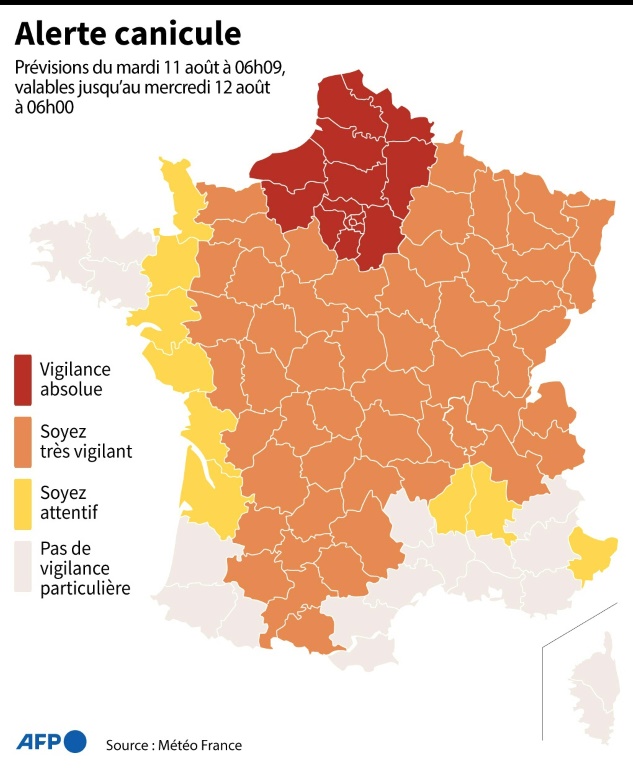 La vague de chaleur qu'a subi le pays devrait se situer parmi les cinq plus sévères connues par la France ces dernières décennies, a souligné Météo-France, en faisant remarquer cependant que cet épisode caniculaire se place derrière les canicules historiques de 2003 et 2006. Des orages ponctuellement forts voire violents, accompagnés localement de grêle, de fortes pluies, de violentes bourrasques ainsi que de nombreuses décharges de foudre sont prévus dans l'après-midi et en soirée sur de nombreux départements.