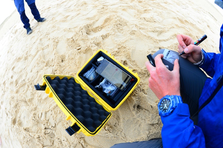 "J'ai des pochons pour les Ă©chantillons, conservĂ©s dans une boĂźte Ă©tanche, et un feutre dans ma poche oĂč je note les coordonnĂ©es GPS du lieu, l'heure et la date", explique Edgar, 23 ans, Ă©tudiant en master de gestion environnemental.