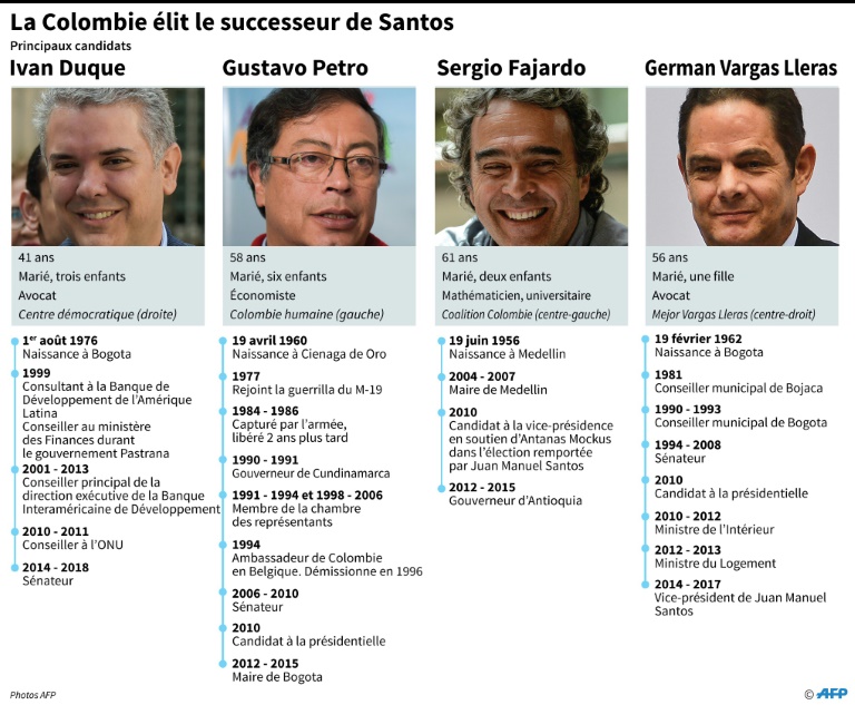 Outre la révision de l'accord de paix, qu'il juge laxiste envers les ex-guérilleros exemptés de prison s'ils admettent leurs crimes, Ivan Duque, 41 ans, promet d'éradiquer la drogue, la corruption et de relancer la 4e économie d'Amérique latine, en berne à 1,8% de croissance. Parmi six candidats, cet avocat et économiste représente une coalition menée par le Centre démocratique (CD) du controversé, mais populaire ex-président Alvaro Uribe. Crédité de 37,6% à 41,5% des voix selon les sondages, Duque défend la liberté d'entreprendre, les valeurs traditionnelles de la famille et vilipende le Venezuela voisin en faillite.