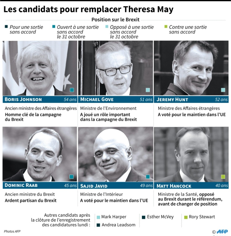 Huit hommes et deux femmes briguent le poste de chef du Parti conservateur, après la démission de Mme May vendredi. Le vainqueur prendra possession du 10, Downing Street, la fonction échéant au leader de la formation réunissant une majorité parlementaire suffisante pour gouverner. Ce processus a lieu en deux temps: les 313 députés conservateurs s'expriment d'abord sur les candidats lors d'une série de votes à bulletin secret jusqu'à ce qu'il n'en reste plus que deux, avant que les 160.000 membres du parti ne départagent les finalistes, d'ici la fin juillet.