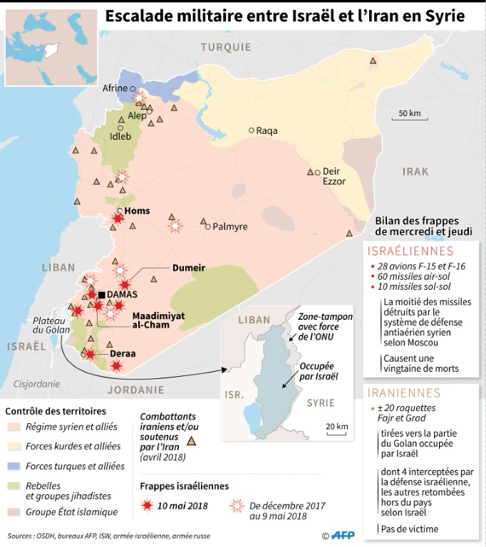 Israël dit avoir mené des dizaines de raids aériens contre des cibles iraniennes en Syrie en représailles au tir par des éléments de la Brigade al-Qods, la force des Gardiens de la Révolution chargée des opérations extérieures, d'une vingtaine de roquettes sur la partie du Golan syrien occupée par l'Etat hébreu.