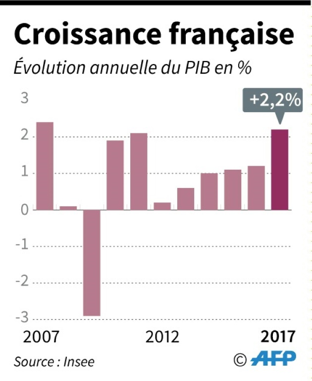 Le produit intérieur brut (PIB) de la France a finalement augmenté de 2,2% en 2017, selon une nouvelle évaluation mardi de l'Insee, qui estimait jusqu'ici la croissance à seulement 2%.