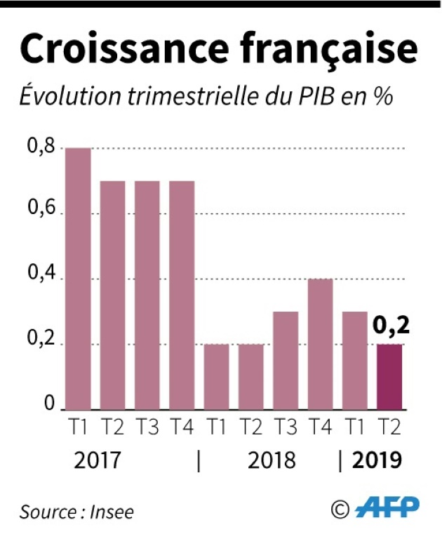 Selon une première estimation publiée mardi par l'Institut national des statistiques et des études économiques (Insee), le produit intérieur brut (PIB) hexagonal a progressé de 0,2% entre avril et juin, contre +0,4% au dernier trimestre 2018 et +0,3% au premier trimestre 2019.