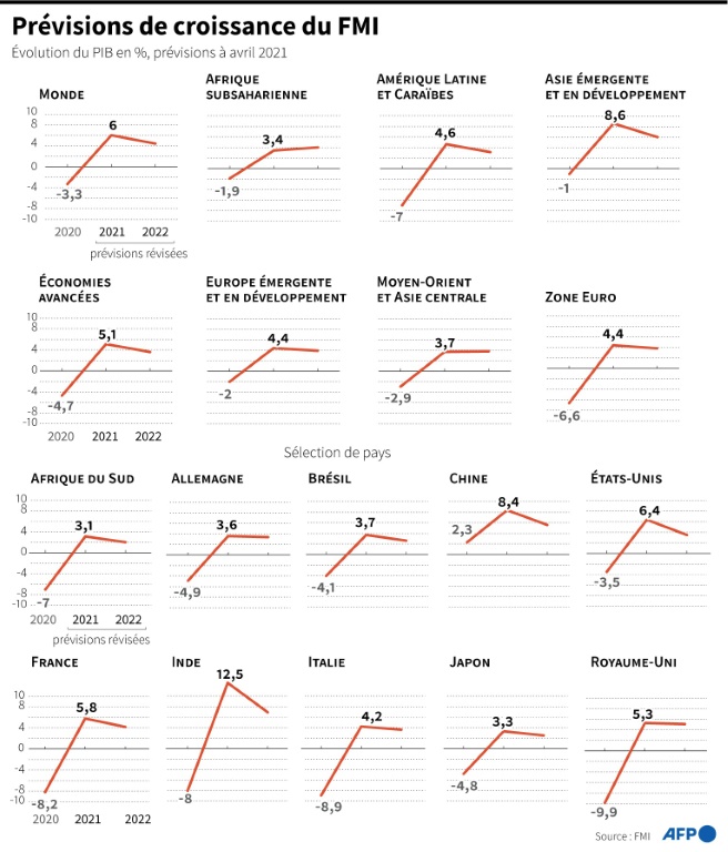 Si le FMI se félicite des retombées positives de la croissance américaine dans le monde, il fait aussi le constat d'une reprise "à plusieurs vitesses" avec de "nombreux pays" qui ne reviendront pas à leur niveau d'avant la pandémie avant 2023, quand la Chine a déjà retrouvé le sien dès 2020. Au sein même des pays avancés, l'écart se creuse avec des pays de la zone euro à la traîne: la croissance devrait atteindre 4,4% cette année, un rythme insuffisant pour effacer la contraction de 6,6% enregistrée l'an passé.