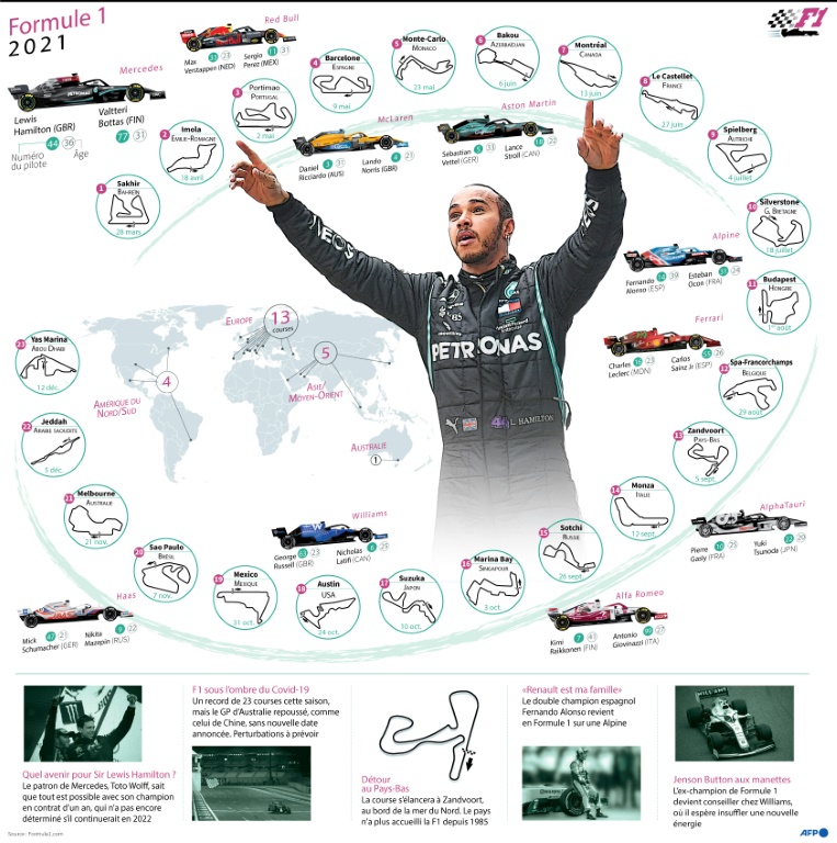 Les Français Pierre Gasly, vainqueur de son premier GP l'an dernier en Italie, et Esteban Ocon, qui a ramené son premier podium de Bahreïn fin 2020, continuent eux chez AlphaTauri et Alpine, pour grandir encore.