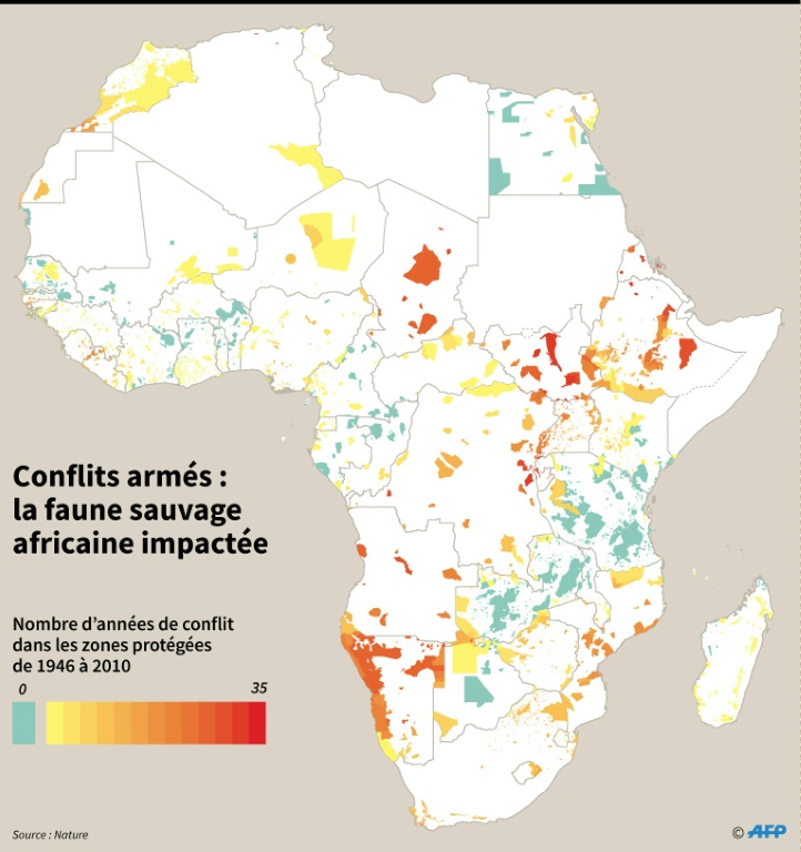 "Les trajectoires des populations sauvages déclinent avec l'augmentation de la fréquence des conflits", affirme l'étude, basée sur l'évolution de 253 populations de 36 espèces de grands mammifères herbivores, dans 126 zones protégées de 19 pays africains. Quelle que soit leur intensité (mesurée en nombre de morts humains), même une augmentation "minime" de la fréquence des guerres conduit ces populations sauvages sous le seuil de remplacement, ajoutent les deux auteurs, qui n'ont pas d'estimation du nombre total d'animaux disparus à cause des conflits.