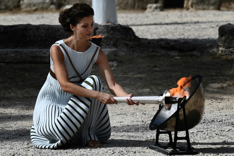 C'est l'actrice grecque Katerina Lehou qui doit allumer la torche, vêtue du costume traditionnel des prêtresses antiques, avant de la tendre au premier membre du relais olympique, le skieur de fond et biathlète grec de 24 ans, Apostolos Angelis.