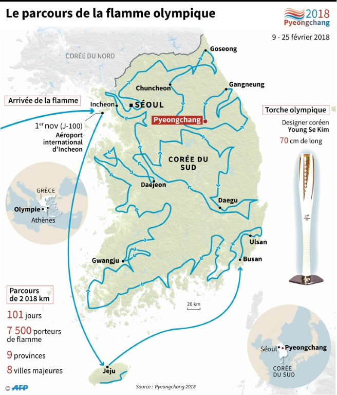 505 relayeurs porteront la mythique torche, et 36 cérémonies officielles sont prévues dans 20 municipalités grecques pour accueillir la flamme, qui sera ensuite transmise le 31 octobre au comité organisateur de Pyeongchang 2018 lors d'une cérémonie au Stade panathéique d'Athènes, qui a accueilli les premiers jeux Olympiques modernes en 1896.