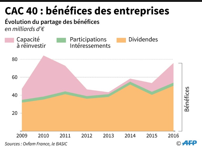 Les groupes du CAC 40 ont ainsi redistribué à leurs actionnaires les deux tiers de leurs bénéfices entre 2009 - année de la crise financière mondiale - et 2016, soit deux fois plus que dans les années 2000, selon la même source. Cela a conduit ces entreprises à ne laisser "que 27,3% au réinvestissement et 5,3% aux salariés", ont calculé les ONG, dénonçant des choix économiques qui nourrissent une "véritable spirale des inégalités".