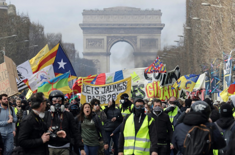 "Macron, on vient te chercher chez toi!" Munis de sifflets et de fumigènes, des milliers de "gilets jaunes" de toute la France arrivés le matin dans les gares parisiennes ont marché vers les Champs-Elysées pour le 18e samedi de manifestation, à Paris.
