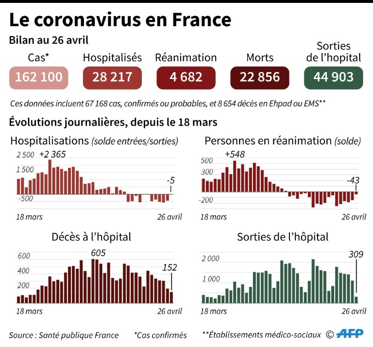 Cela fait presque six semaines que le pays est confiné pour freiner la propagation du nouveau coronavirus qui a fait depuis le 1er mars 22.856 morts dans le pays, dont 242 nouveaux décès en 24 heures. Parmi les morts: l'ancien sénateur Henri Weber, cofondateur de la Ligue communiste révolutionnaire, figure de la gauche et de mai 68, décédé à 75 ans.
