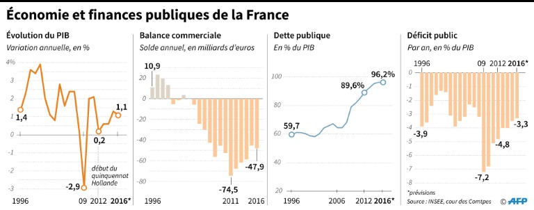 Des progrès laborieux sur le front des finances publiques: la France a réduit son déficit public en 2016, mais dans une proportion plus faible que prévu, en raison notamment d'une croissance décevante.