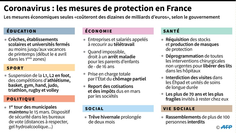 Terrasses fermées et rideaux de fer baissés : la France vit dimanche le premier jour des restrictions et fermetures décidées par le gouvernement pour tenter d'enrayer l'épidémie de coronavirus, tout en s'interrogeant sur la pertinence d'aller aux urnes pour le premier tour des municipales, maintenu malgré les circonstances.