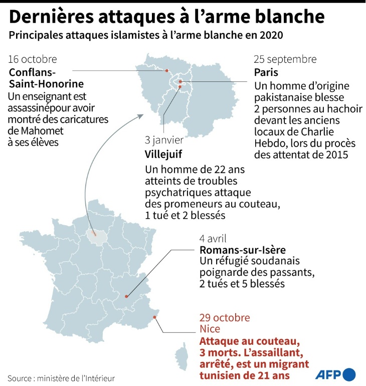 Cible de deux attaques jihadistes sur son sol en moins de deux semaines, La France réunit vendredi un conseil de défense. Mi-octobre un professeur de collège de la région parisienne, Samuel Paty, avait été décapité par un islamiste d'origine russe tchétchène lui reprochant d'avoir montré des caricatures du prophète Mahomet à ses élèves.