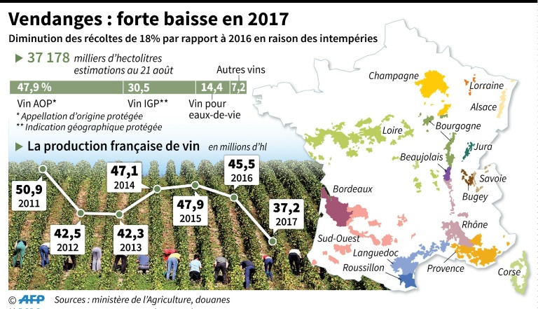 "La production de vin pourrait s'établir en 2017 à 37,2 millions d'hectolitres, soit un niveau inférieur de 18% à celui de 2016, et de 17% à celui de la moyenne des cinq dernières années", indique le service statistiques du ministère de l'Agriculture, Agreste, dans un communiqué.
