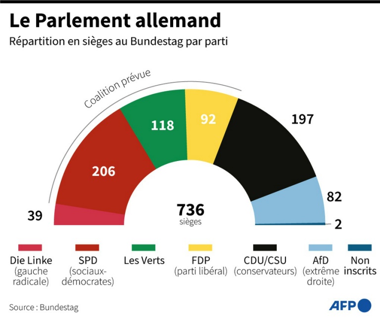Un mariage en pleine flambée de Covid: les trois partis allemands qui vont succéder au pouvoir aux conservateurs d'Angela Merkel prévoient de conclure la semaine prochaine leur "contrat de coalition", ouvrant la voie à l'élection début décembre d'Olaf Scholz comme chancelier.