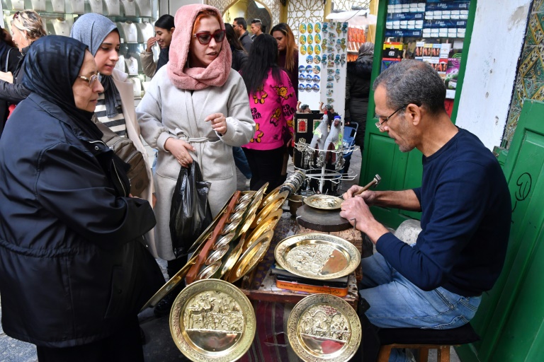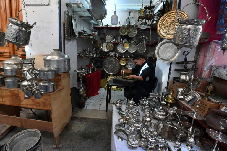 Dans son atelier du "Village de l'artisanat" à Denden, dans l'ouest de Tunis, Chiheb Eddine Ben Jabballah, 68 ans, enseigne souvent son art à des femmes désireuses de créer des bijoux ou fabriquer des couffins, avec des ornements en cuivre ciselé.