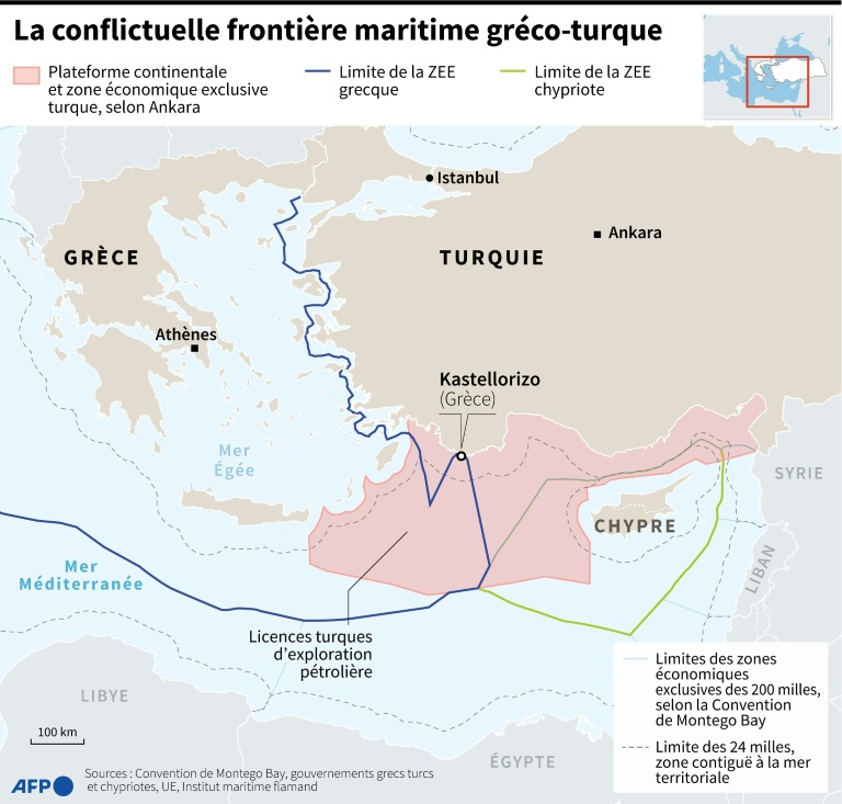 Ces derniers mois, la France s'est rangée démonstrativement au côté d'Athènes et a envoyé pendant l'été des Rafale et des navires de guerre face au déploiement de navires militaires et de prospection turcs dans une zone revendiquée par la Grèce. Des actions turques qualifiées en décembre d'"illégales et agressives" par les dirigeants de l'Union européenne.