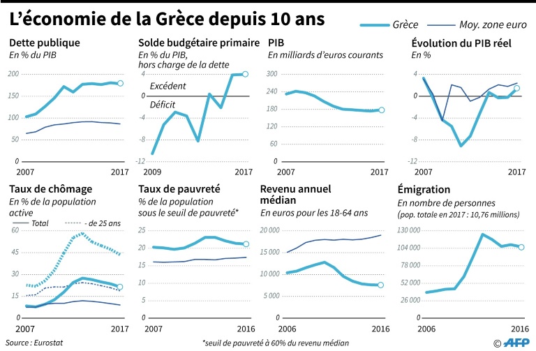 En trois plans successifs (2010, 2012 et 2015) elle aura reçu 289 milliards d'euros de prêts. Mais les réformes exigées en contrepartie par le Fonds monétaire international (FMI) et les autorités européennes l'ont mise sur le flanc : un quart du PIB évaporé en huit ans - la croissance a repris en 2017 - et un chômage qui vient seulement de redescendre sous 20% après un pic à 27,5% en 2013.