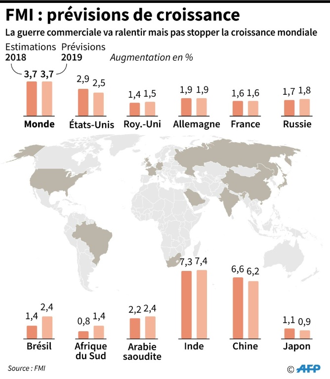 Mais le FMI estime que la croissance va ralentir en 2019, Ă 2,5% pour les Etats-Unis (-0,2%) et +6,2% (-0,2%) pour la Chine.