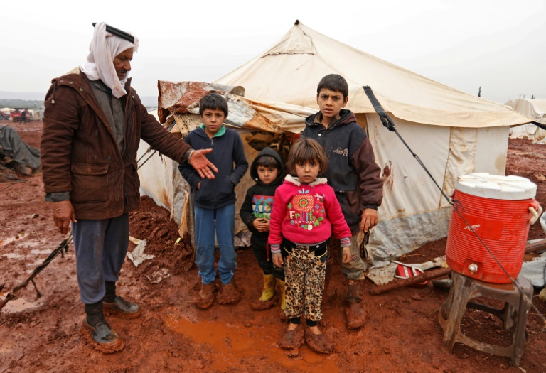 Voilà six ans qu'Abou Khaled, sa femme et ses enfants vivent dans une tente, installée au milieu de champs boueux. Dans la province rebelle d'Idleb, la guerre qui ravage la Syrie les pourchasse, et quatre fois déjà , la famille a été jetée sur les routes. "Dès qu'on s'installe, un an tout au plus, les frappes arrivent et on change d'endroit", explique le septuagénaire, qui a élu domicile dans un campement informel regroupant des dizaines de tentes près de la localité de Sarmada.