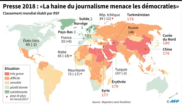 En outre, RSF s'alarme de la multiplication des violences verbales contre la presse en Europe, où deux journalistes ont été assassinés ces derniers mois (le Tchèque Jan Kuciak et la Maltaise Daphne Caruana Galizia). Si la Norvège maintient son 1er rang au classement, "il y a une inquiétude très forte pour les démocraties européennes", estime M. Deloire.