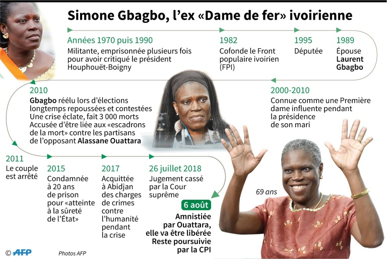 Epouse influente de Laurent Gbagbo, président de 2000 à 2010, la "Dame de fer" ivoirienne aura passé sept ans derrière les barreaux. Elle avait été arrêtée le 11 avril 2011 au côté de son mari, vaincu par les forces d'Alassane Ouattara et de la communauté internationale, au terme de plusieurs mois de crise après l'élection présidentielle aux résultats contestés d'octobre 2010.