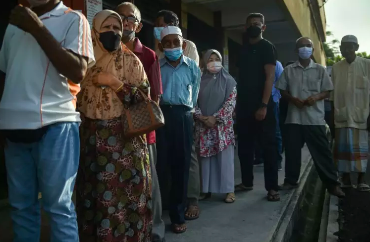 Dans la ville rurale de Bera (centre), dans l'Etat de Pahang, des femmes portant le foulard traditionnel malais sont allées voter en voiture ou à moto, tandis que certaines personnes âgées y sont allées en fauteuil roulant.