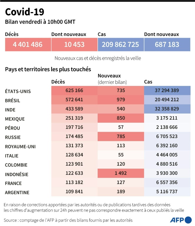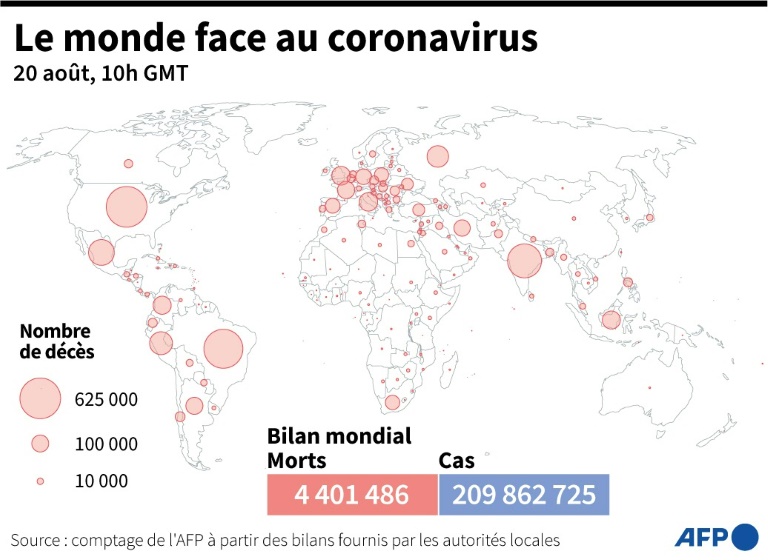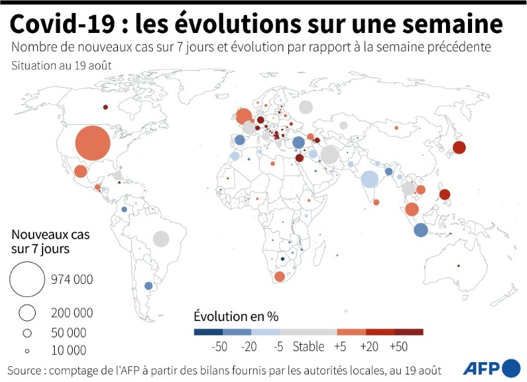 Avec 643.100 contaminations enregistrées quotidiennement dans le monde cette semaine, l'indicateur s'est stabilisé au même niveau que la semaine précédente, selon un bilan de l'AFP arrêté à jeudi. La pandémie gagnait de nouveau du terrain depuis la mi-juin, attisée par un variant Delta très contagieux et devenu majoritaire dans de nombreux pays.