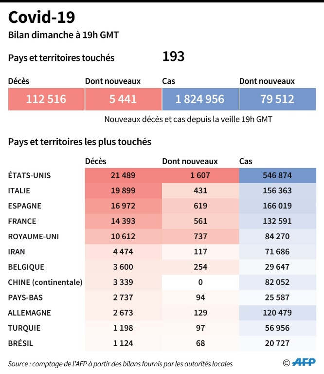 La maladie Covid-19 a déjà tué plus de 112.500 personnes dans le monde depuis son apparition en décembre en Chine, un chiffre qui a doublé en un peu plus d'une semaine. Les Etats-Unis restent le pays le plus endeuillé avec au moins 22.020 décès pour plus de 555.000 cas confirmés. Avec un total de 75.011 morts (pour 909.673 cas), l'Europe demeure le continent le plus durement touché par la pandémie.