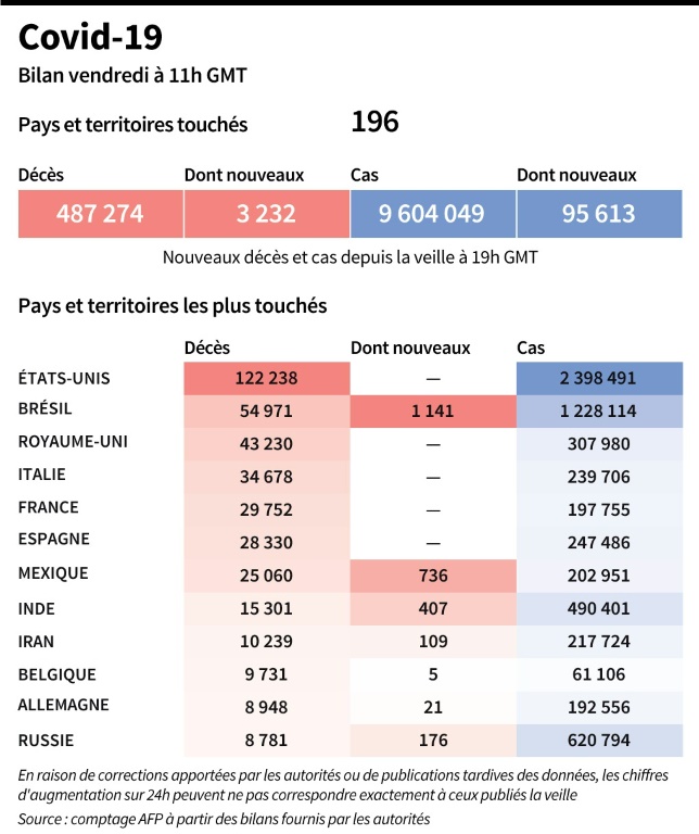 Au total, la pandémie a fait au moins 487.274 morts dans le monde, depuis que la Chine a annoncé les premiers cas en décembre, selon un bilan de l'AFP vendredi. La barre des dix millions de cas devrait être franchie la semaine prochaine, selon l'OMS.
