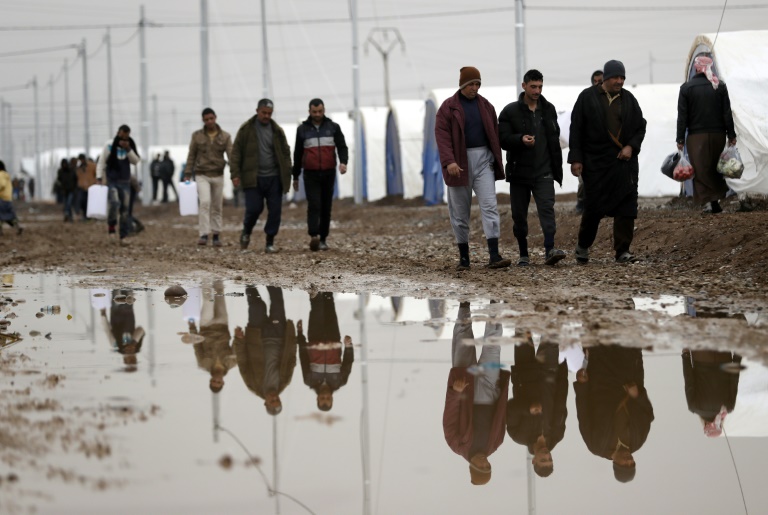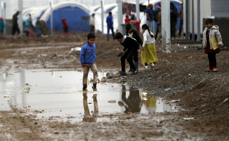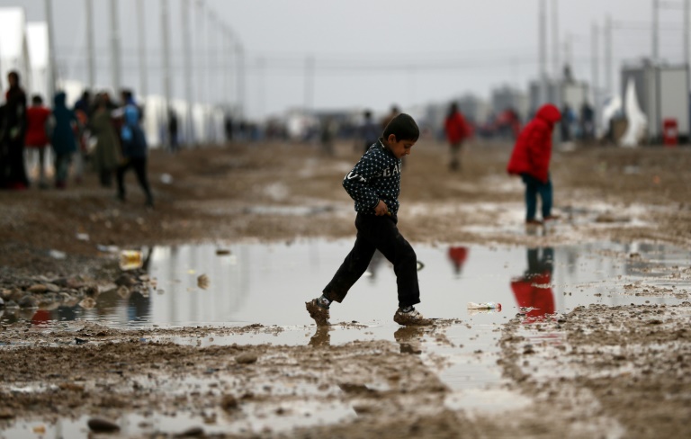 Abdelwahed Mahmoud creuse à la main une petite tranchée dans la boue, tout autour de sa tente: les fortes pluies tombées la nuit dernière sont un nouveau coup dur pour les milliers de familles de déplacés autour de Mossoul.
