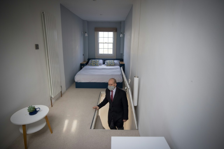 L'étrange propriété, dont la façade constitue une petite bande bleue foncée très discrète dans la rue, vient d'être mise en vente, estimée à 950.000 livres (1,1 million d'euros).