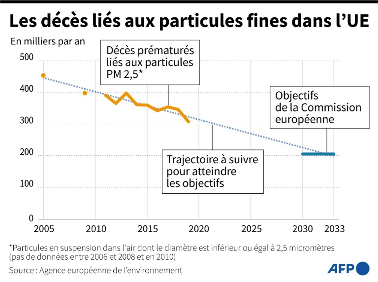 L'Union européenne s'est fixée comme objectif d'avoir réduit d'au moins 55% en 2030 le nombre de décès prématurés causés par les particules fines, par rapport aux niveaux de 2005. Si la pollution de l'air diminue au rythme actuel, l'agence estime que cet objectif serait atteint d'ici 2032.