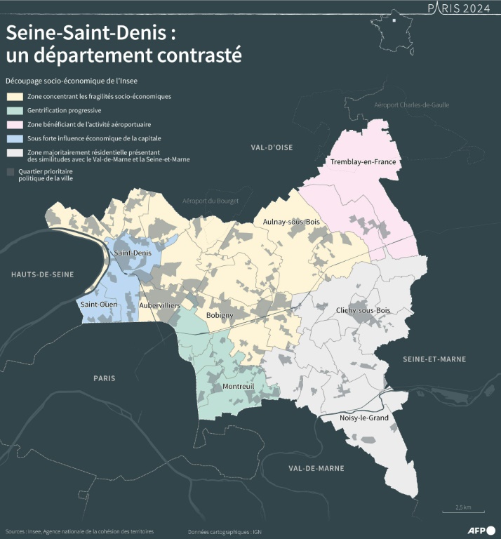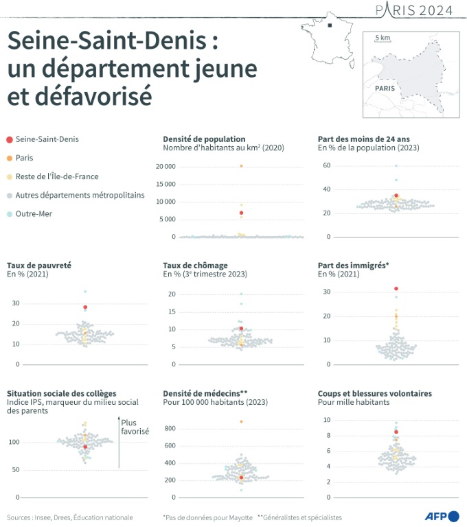 Le département du nord de Paris, qui accueille quatre sites de compétition et plusieurs ouvrages clés comme le village des athlètes, est parmi les plus criminogènes du pays - souvent associé à l'étranger au chaos autour du Stade de France lors de la finale de la Ligue des Champions en 2022.
