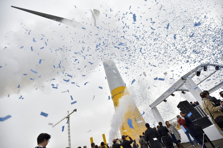 Ses pales de 40 mètres de long étaient plongées dans le brouillard vendredi matin sur les quais du port de Saint-Nazaire, où sa construction a démarré en juin 2016 après trois années d'études.