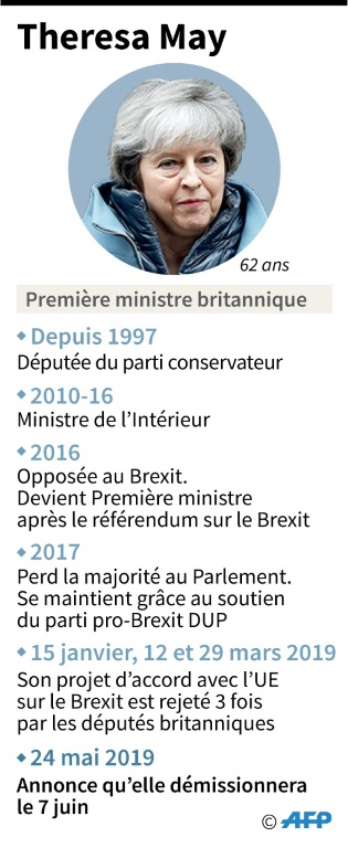 La Première ministre britannique Theresa May, usée par l'interminable casse-tête du Brexit qu'elle n'a pas su mettre en oeuvre, a annoncé vendredi sa démission, au bord des larmes, laissant à celui ou celle qui lui succèdera un pays paralysé par les divisions.