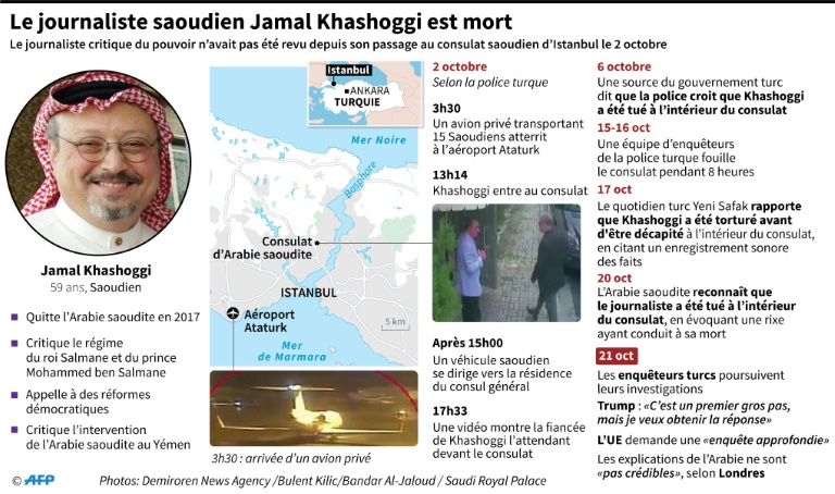 Les aveux, émaillés de contradictions, de Ryad sur les circonstances de la mort du journaliste, continuent de susciter une vague de scepticisme dans le monde. Ryad a annoncé le limogeage du numéro deux du Renseignement saoudien, le général Ahmed al-Assiri, et de trois autres hauts responsables de ces services, ainsi que d'un conseiller "médias" à la cour royale, Saoud al-Qahtani. Dix-huit suspects saoudiens ont été interpellés.